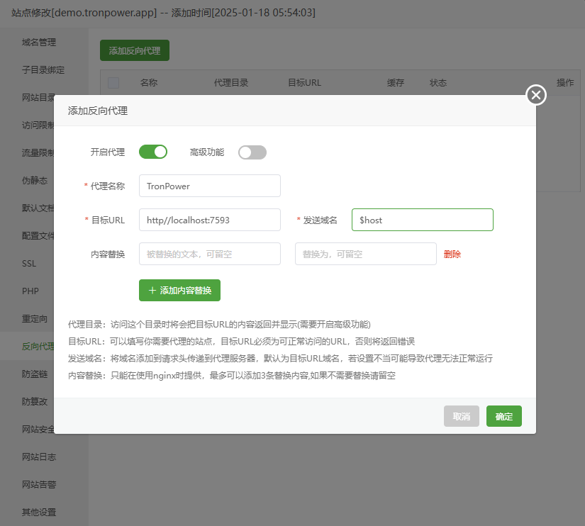 默认情况下,程序使用7593端口。请反向代理http://localhost:7593,发送域名为$host。